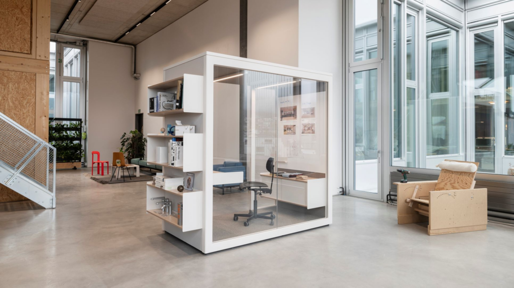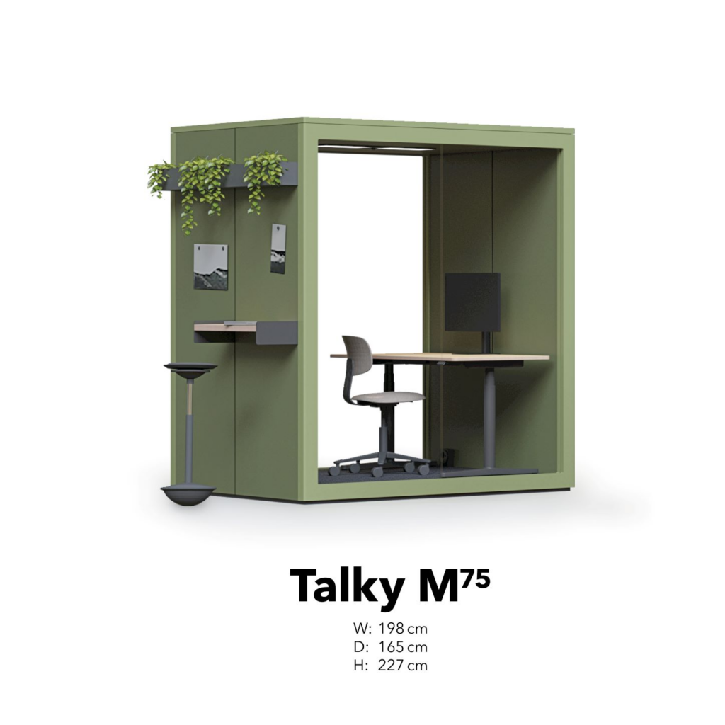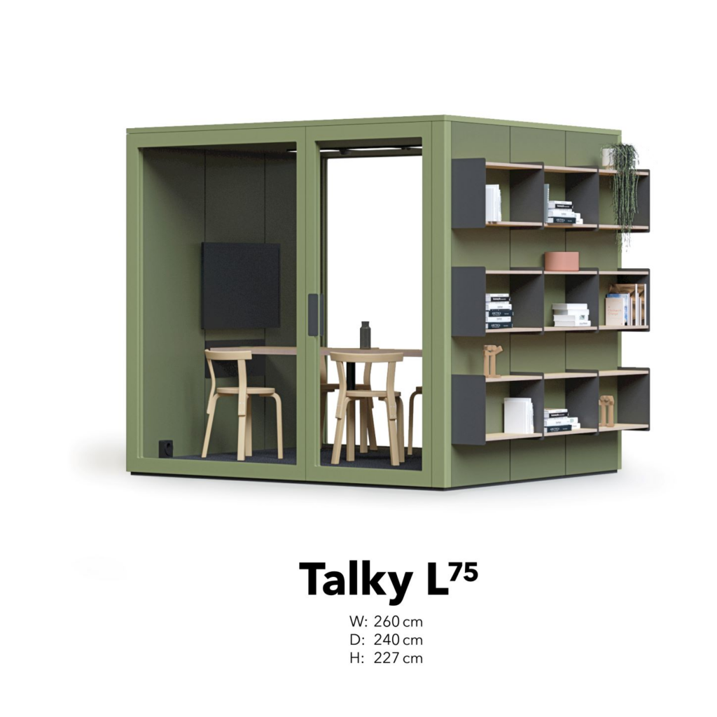 Talky L75: Thanks to its first-class acoustic insulation value and low-noise ventilation, Talky L75 is perfect as a boardroom for team meetings or video calls. But also as a retreat for concentrated focus work or as a quiet room for regeneration.