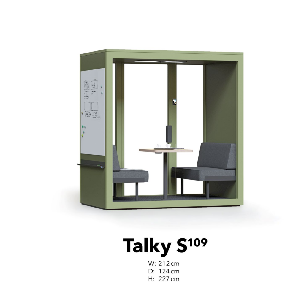 Talky S109: Alone or together? Talky S109 offers space for both. Whether it’s a meeting room, micro office or stylish lounge, easily make it what you and your team need. Experience a clean design that fits any office, excellent soundproofing, and great air quality thanks to powerful ventilation.