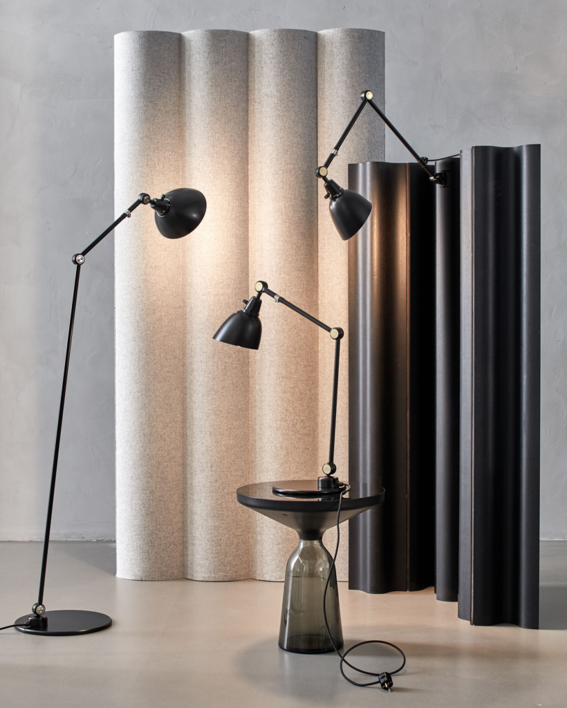 Available as table, office, floor and wall lamps. Different arm lengths, as well as a choice of joint and lamp color, allow for custom configurations. The patented shades allow 360 degree rotation, and the patented joints allow for a maintenance free lamp.